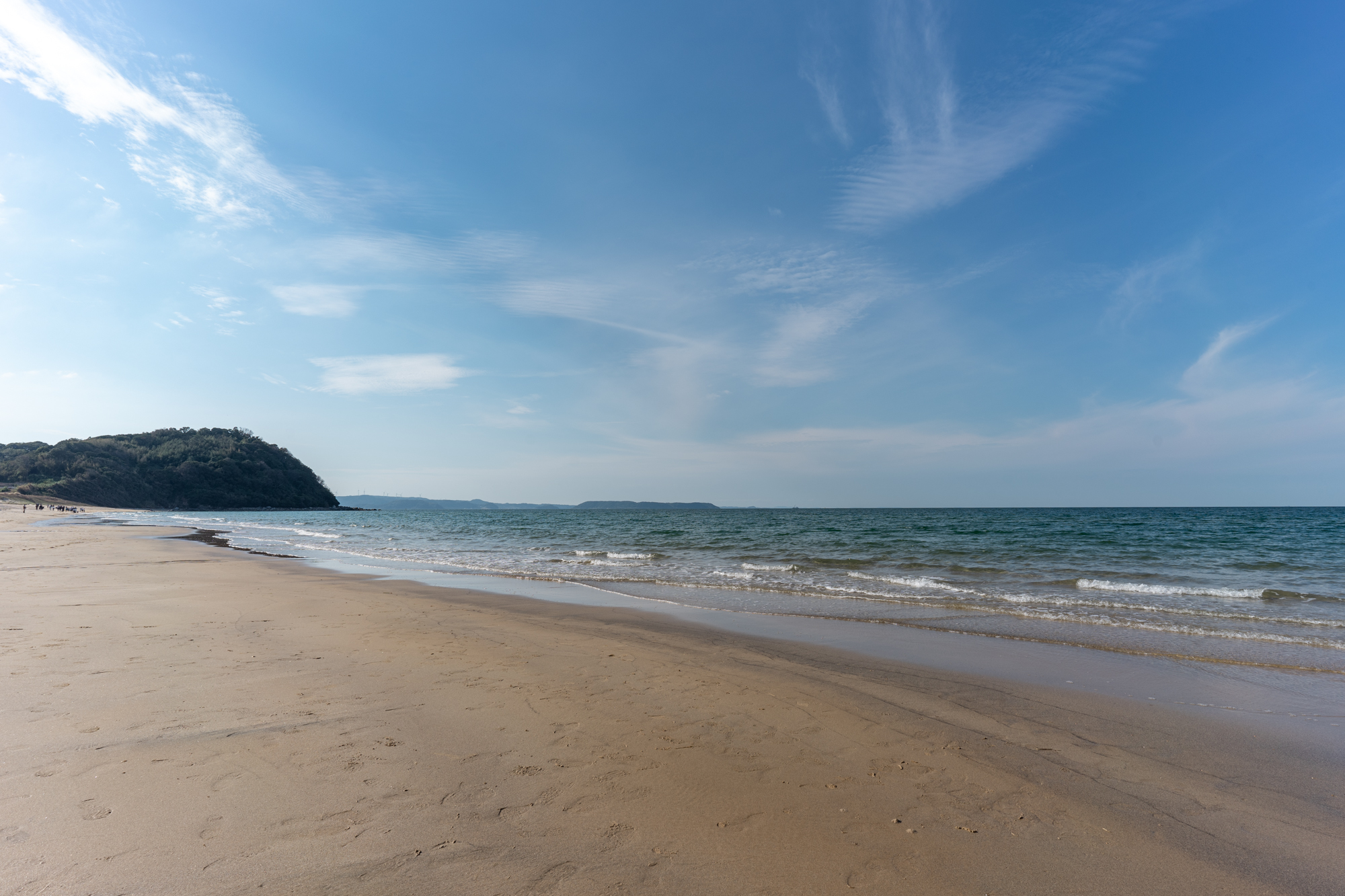 浜の形は弓なりで、長さは約1.1 km、幅は約20 mほどあります。