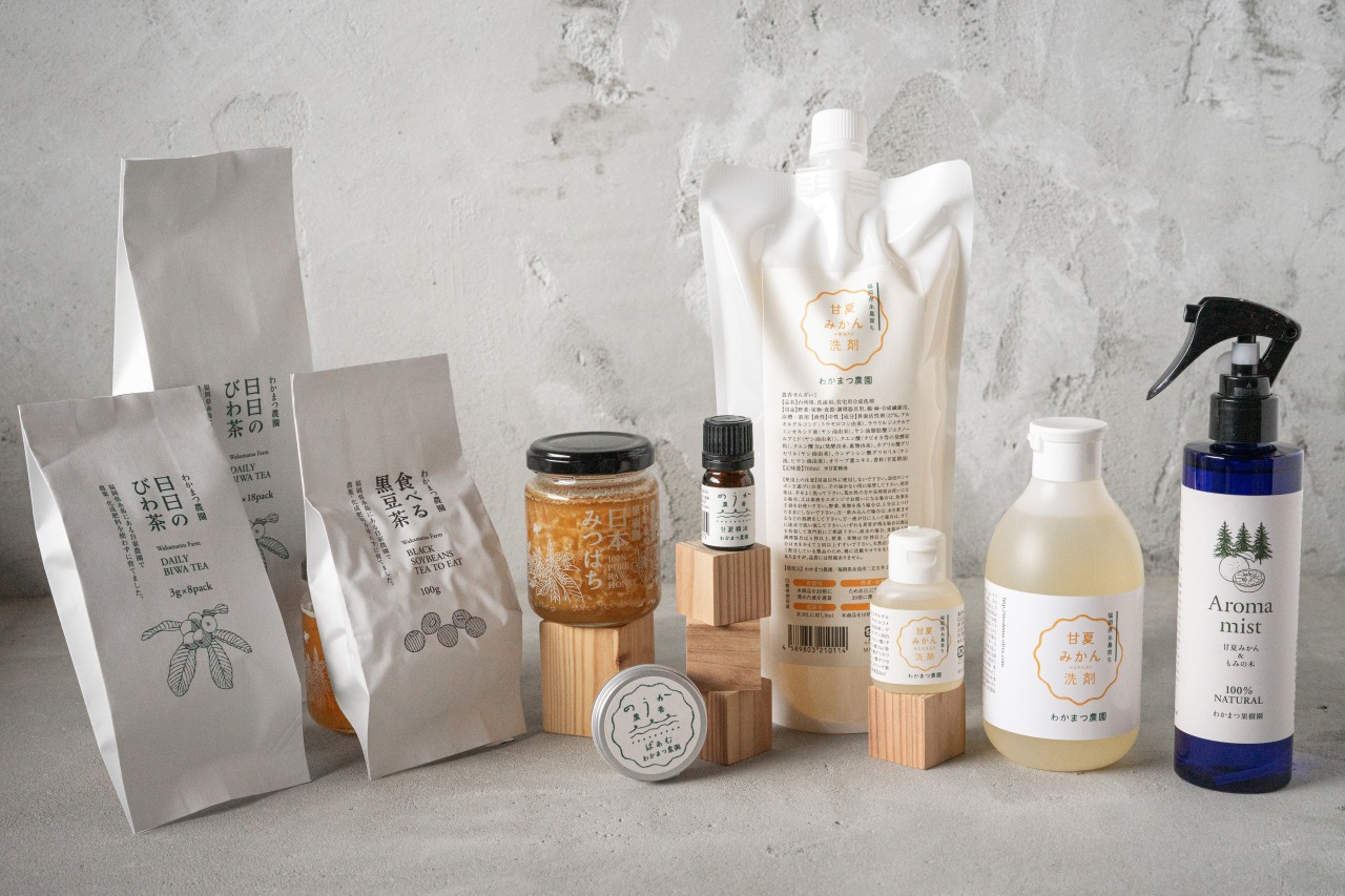 • 直売所では、農菜や化学肥料を使わずに栽培したわかまつ農園の作物を、お茶や暮らしのモノに加工して「農香シリーズ」として販売しています。自然由来の無添加製法なので、小さなお子さまや敏感肌の方にもお使いいただけます。