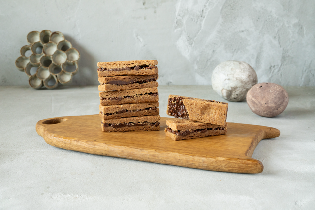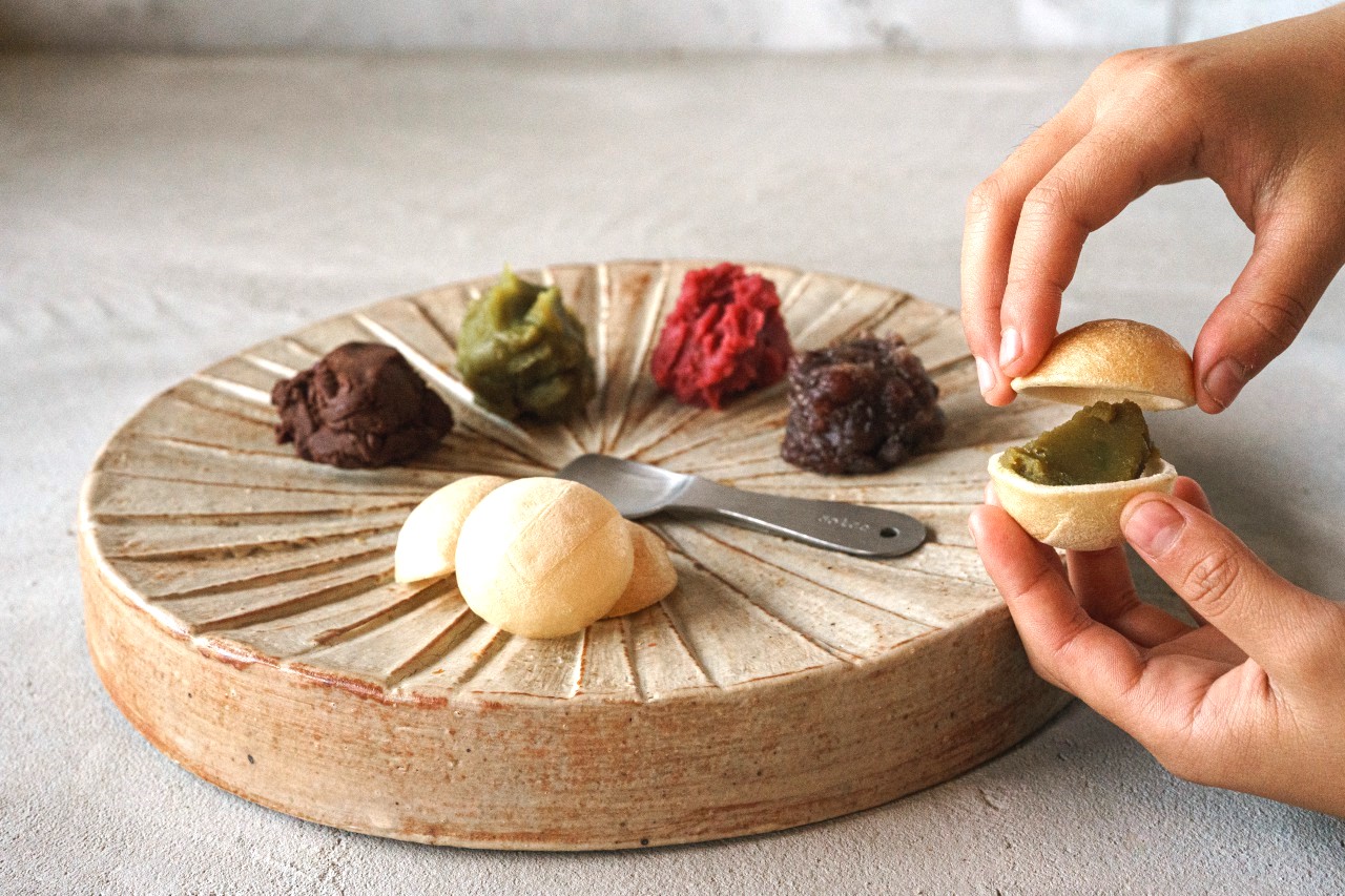 オリープリーフ、ビーツ、カカオ、あんこの4種の餡を、サクサクのモナカに手詰めする手作りモナカです。